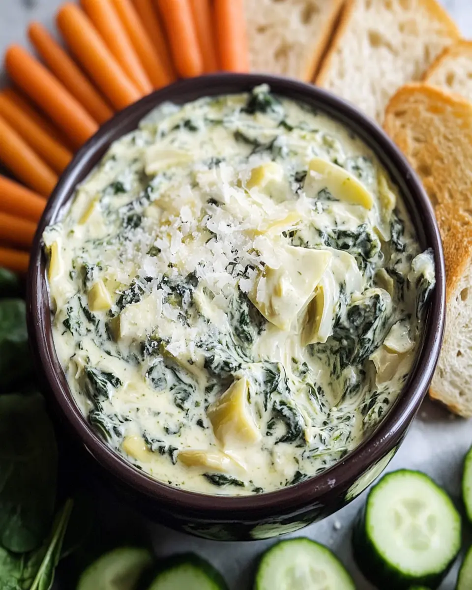 A creamy and savory dip featuring spinach and artichokes, perfect for parties or game days.
