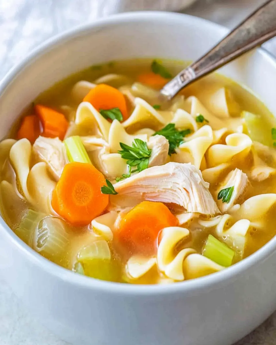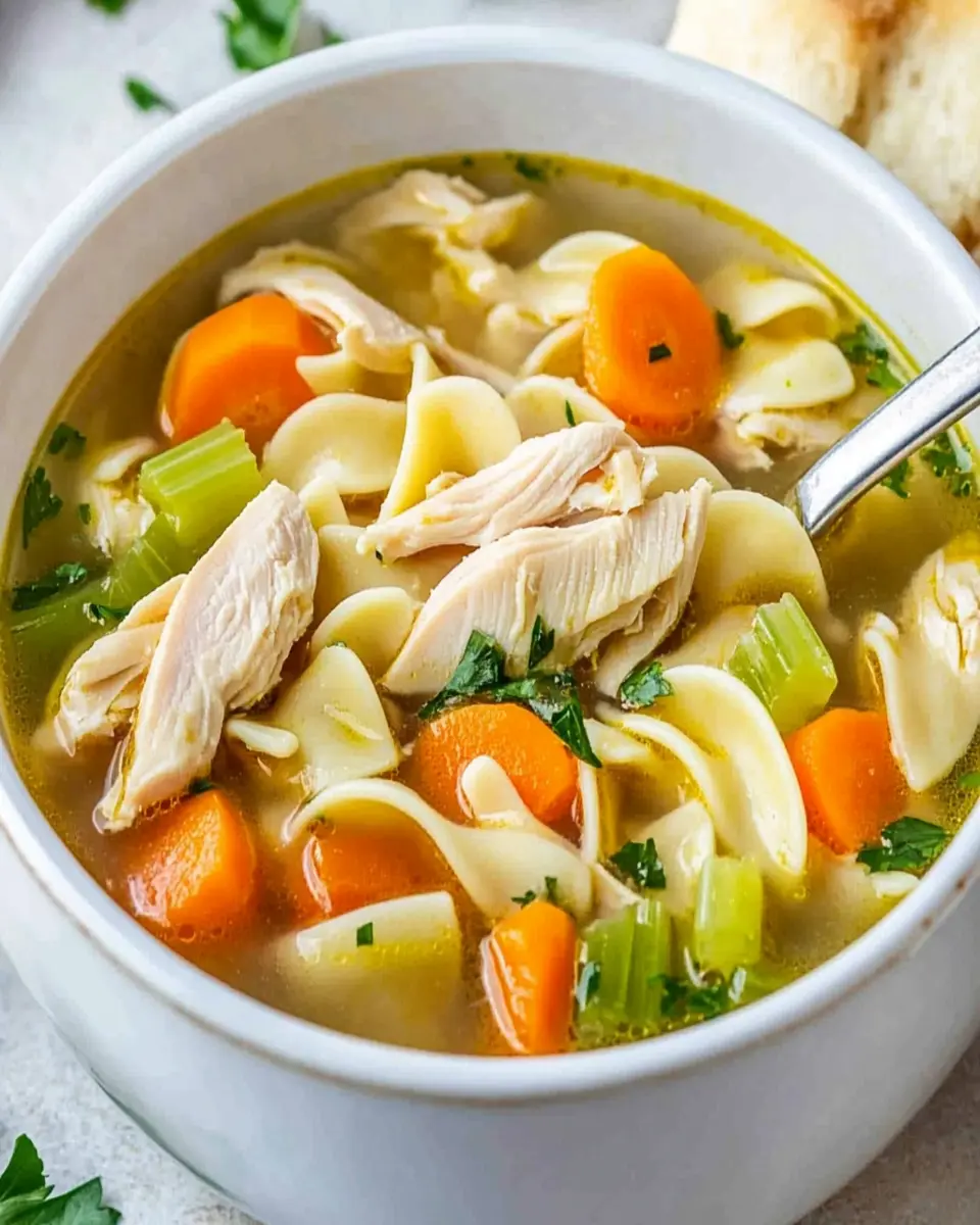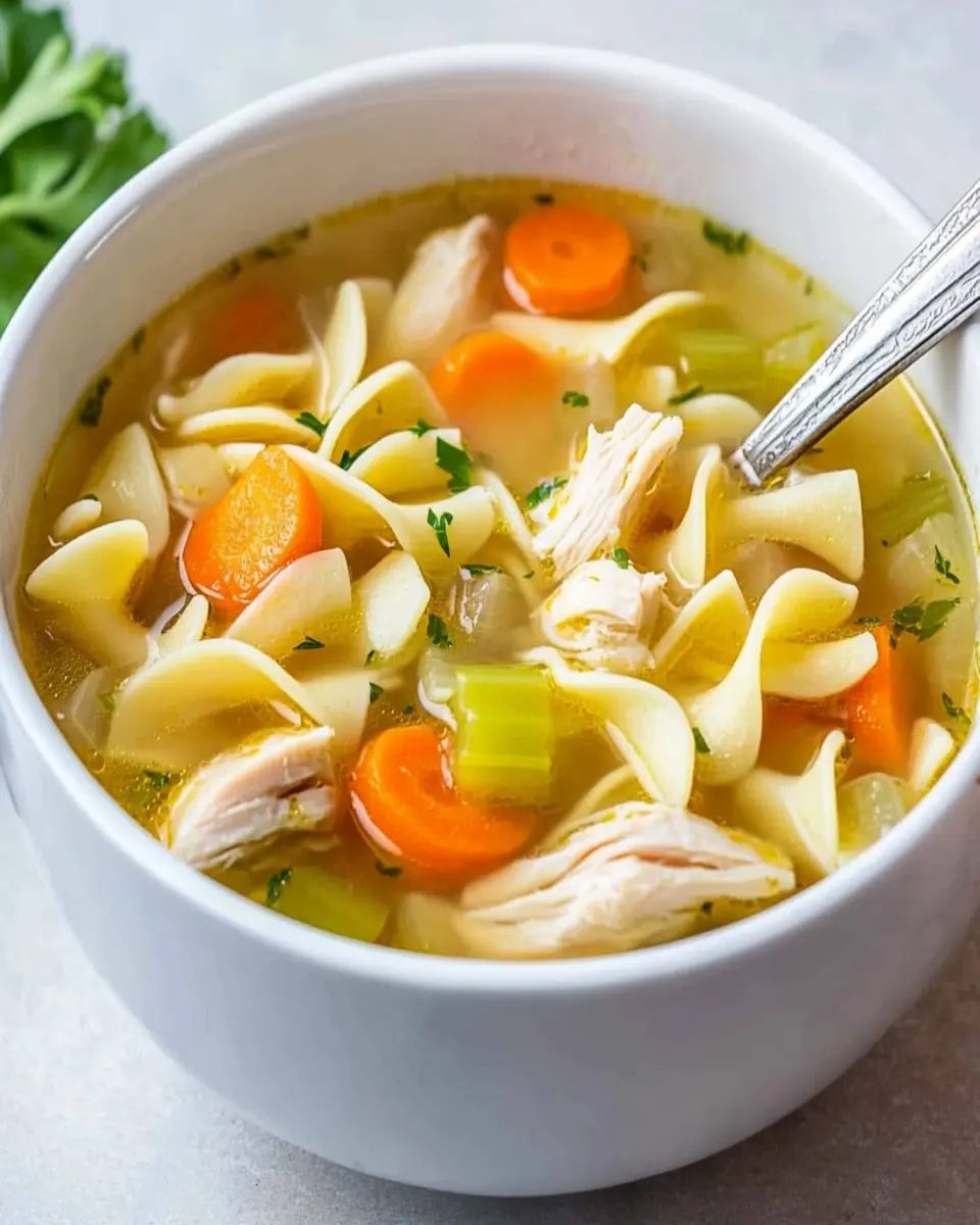 In conclusion, Easy Chicken Noodle Soup is not just a meal; it’s a comforting embrace in a bowl, perfect for busy young professionals and homemade-food lovers alike. With its simple ingredients and quick preparation time, you can enjoy a delicious, hearty soup that warms the soul after a long day. This recipe allows for personalization, making it easy to adapt to your taste and dietary needs. Whether you’re preparing it for a cozy night in or meal prepping for the week ahead, this soup is sure to become a cherished favorite. So gather your ingredients, whip up a pot, and savor every spoonful. Don’t forget to cook, save, share, or comment on your experience!