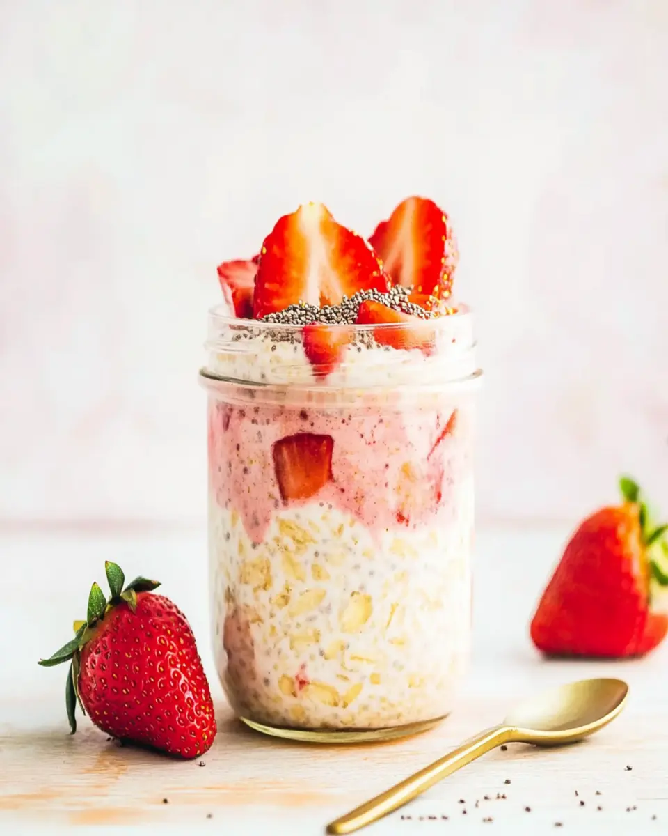Strawberry Overnight Oats are not only delicious but also nutritious. Each serving provides a well-balanced meal, containing approximately 300 calories. You’ll get 10 grams of protein, which is essential for muscle repair and growth, and 8 grams of fiber, promoting digestive health. The oats are rich in complex carbohydrates, supplying long-lasting energy throughout your busy day. Additionally, the healthy fats from chia seeds and yogurt help keep you satisfied. This recipe also features a moderate amount of sugar at 10 grams, making it a healthy option for breakfast. The combination of these nutrients makes Strawberry Overnight Oats a great choice for anyone looking to fuel their morning with a wholesome meal!
